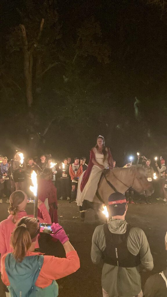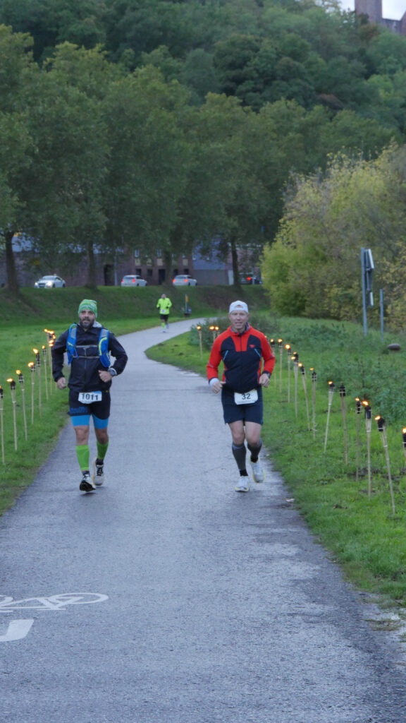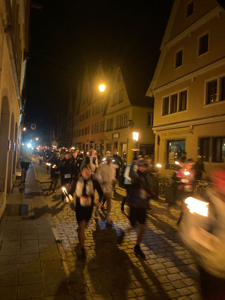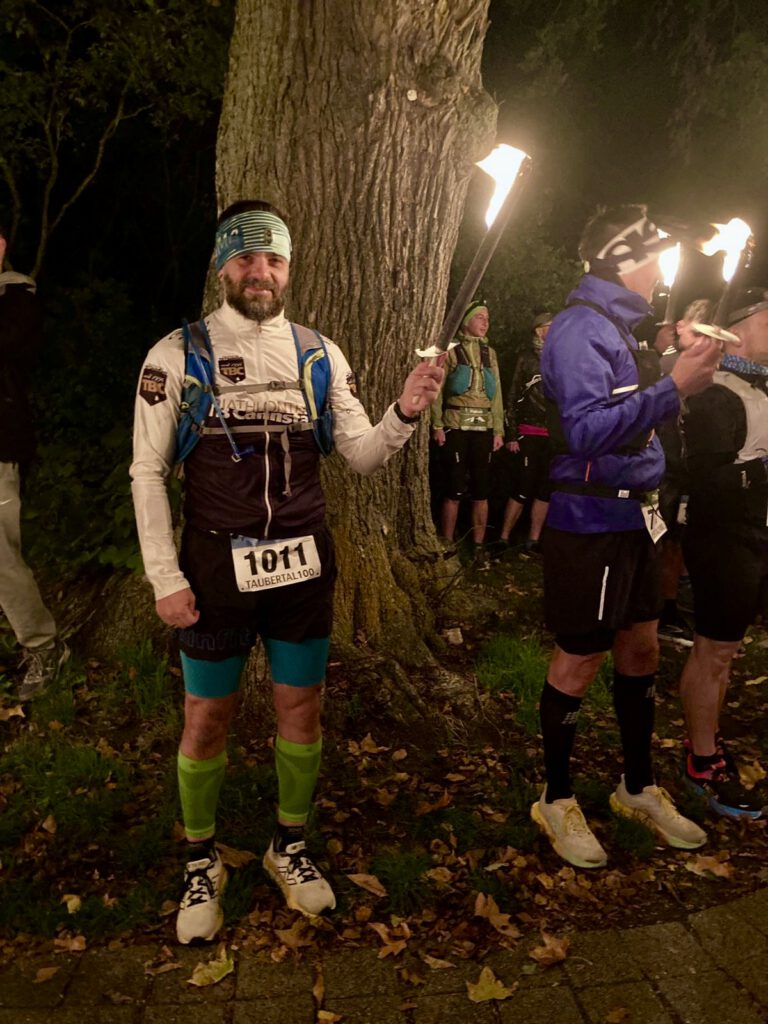 Der T100 ist einfach perfekt organisiert. Zum Frühstück muss ich mich zwingen zum Essen, aber es geht alles ganz gut und schon steht man mit Stirnlampe und Fackel in der Hand am Ausgangspunkt. Lockerer Lauf durch die Stadt zur Beauftragung als Botenläufer. Einfach schön gemacht und auch motivierend. Es beginnt leichter Nieselregen. Temperatur aber OK. Danach lockerer Lauf zur Eiswiese. Permanentes Abchecken der Beine. Fühlt sich gut an. Normalerweise stehe ich am Start und komme in den Modus, der mir sagt, jetzt machst du das. Diesmal nicht. Ich kann es mir einfach nicht ausmalen und laufe locker los. Ziel ist es die 07:00min/km so genau und lange wie möglich zu halten. Dann sehen wir mal, was das Training gebracht hat. Ich verpflege alle 30min mit einem Gel mit 45g KH. Jede VP wird voll mitgenommen, Kartoffelbrei, Salz, Chiasamen und ISO Getränk. An dieser Stelle ein großer Dank an meinen Magen, der nimmt sowas ja gelassen hin … also fast.