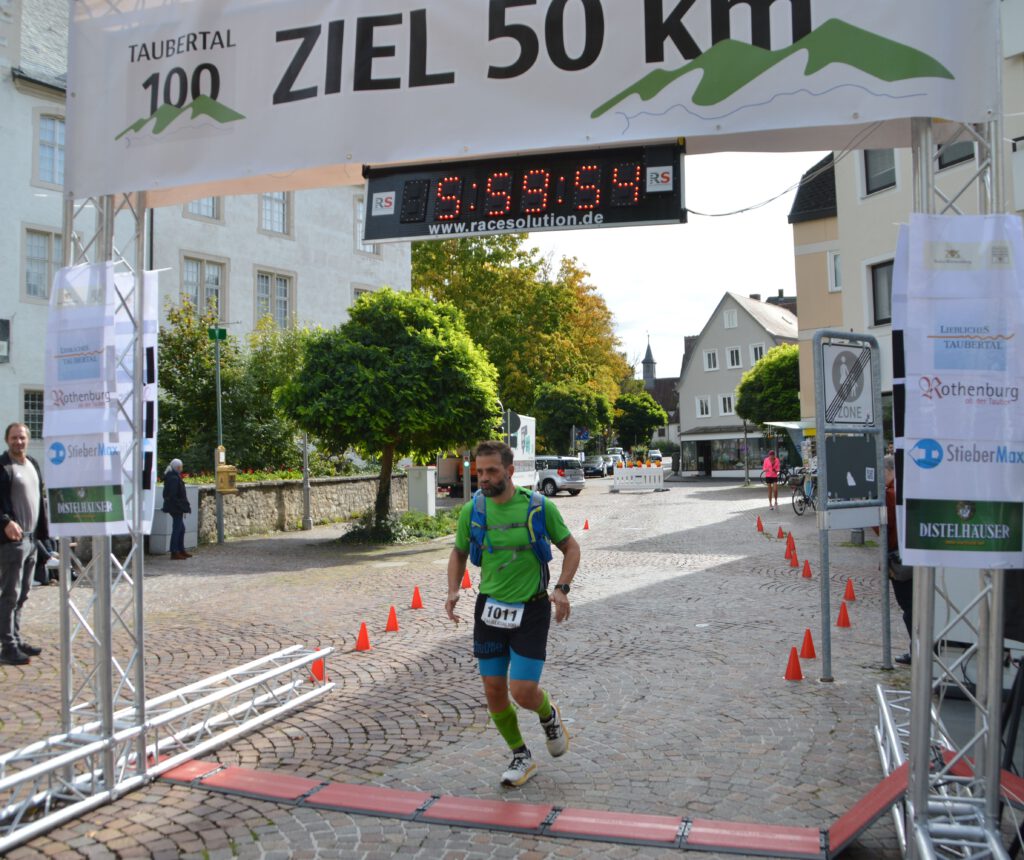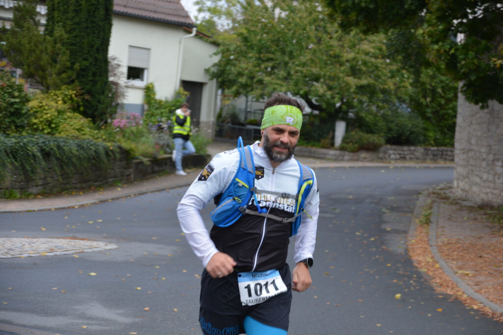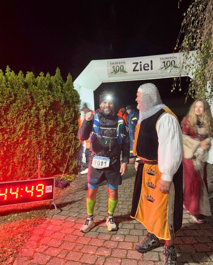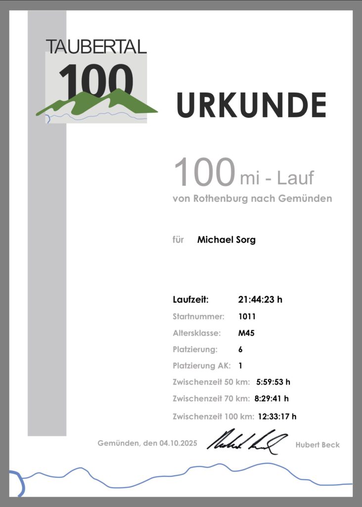 Der Ultraläufergott stellt meinen Willen zum Finish noch in Wertheim auf die Probe und schickt Tief Detlef vorbei. Ich habe zum Glück noch rechtzeitig die Regenjacke angezogen, denn was dann kam war schon heftig. Sturmböen, der Regen kam waagerecht und wurde stilvoll ergänzt durch Hagel. Blitz und Donner rundeten das Menue klangvoll und visuell ab. Und dann kam der Moment, den ich so liebe. Ich lache und grinse vor mich hin und spreche es aus: Hier hält mich keiner mehr auf. Das bringe ich zu Ende. Ich bin motiviert und versuche sogar weiter die 7min/km zu halten. Bei km100 hatte ich noch eine Geheimwaffe ausgepackt und mir Musik auf die Ohren geknallt. 5 Finger Death Punch und Volbeat tun ihr Übriges und ich nehme mir vor 5km laufen, dann verpflegen und weiter. Die Pace ging dann natürlich runter und man musste auf den Wegen schon aufpassen, dass man nicht über das Astwerk der Bäume und Nüsse und Kastanien nach dem Regen stolperte. Die Fußsohlen fangen an zu brennen, weil einfach alles durchgeweicht ist und reibt. Nicht schön, aber gut. Bis km 130 bin ich noch halbwegs beieinander, dann wurde es zäh. Eine neue Strategie musste her. Der T100 ist tatsächlich bis zum Ende mit jedem KM durchmarkiert. Der neue Plan war laufen bis zur KM-Marke, 200m gehen, dann weiter bis zur nächsten KM-Marke usw. Es ging, war aber schon eine ordentliche Schinderei. Die Knie sangen auch schon ein Halleluja. Nun ja, es ist dann nun mal, wie es ist und wenn man schön tapfer im Kopf bleibt und einen Schritt nach dem anderen macht, dann ist man irgendwann im Ziel. In Gemünden geht es zum Finale nochmal einen Anstieg hoch und es ist vollbracht. 100 Meilen in 21 h 45min … wer hätte es gedacht.
